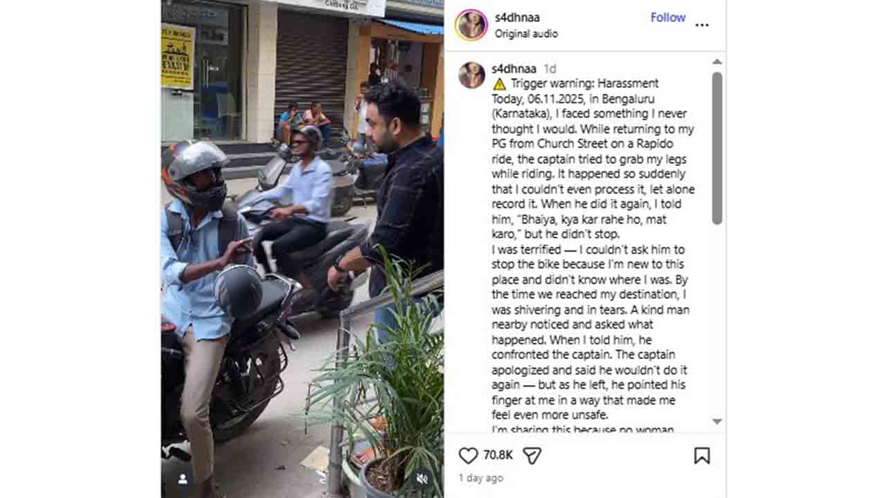 ওঙ্কার ডেস্ক : ইনস্টাগ্রামে র্যাপিডো নিয়ে একটি ভিডিও ভাইরাল হয়েছে। ভিডিওটি যিনি শেয়ার করেছেন তিনি হলেন বেঙ্গালুরুর এক মহিলা। তাঁর অভিযোগ, বৃহস্পতিবার সন্ধ্যায় শহরের সেন্ট্রাল এলাকায় যাবার সময় র্যাপিডো চালক তাঁর সঙ্গে অশালীন আচরণ করেছে। বাধা দেওয়া সত্ত্বেও ওই র্যাপিডো চালক তাঁর কথায় কর্ণপাত করেনি। চালকের “অসভ্যতামি”র নিয়ে ওই মহিলা তাঁর সোশ্যাল মিডিয়ার অ্যাকাউন্টে বিস্তারিত জানিয়েছেন। বলেছেন, বাইক চলাকালীন পিছনে বসা অবস্থায় তাঁর ঊরুতে হাত রাখে চালক। কিছুক্ষণ পর হাত বোলাতে শুরু করে। বারণ করা সত্ত্বেও ওই বাইক চালক তাঁর ঊরু থেকে হাত সরায়নি।