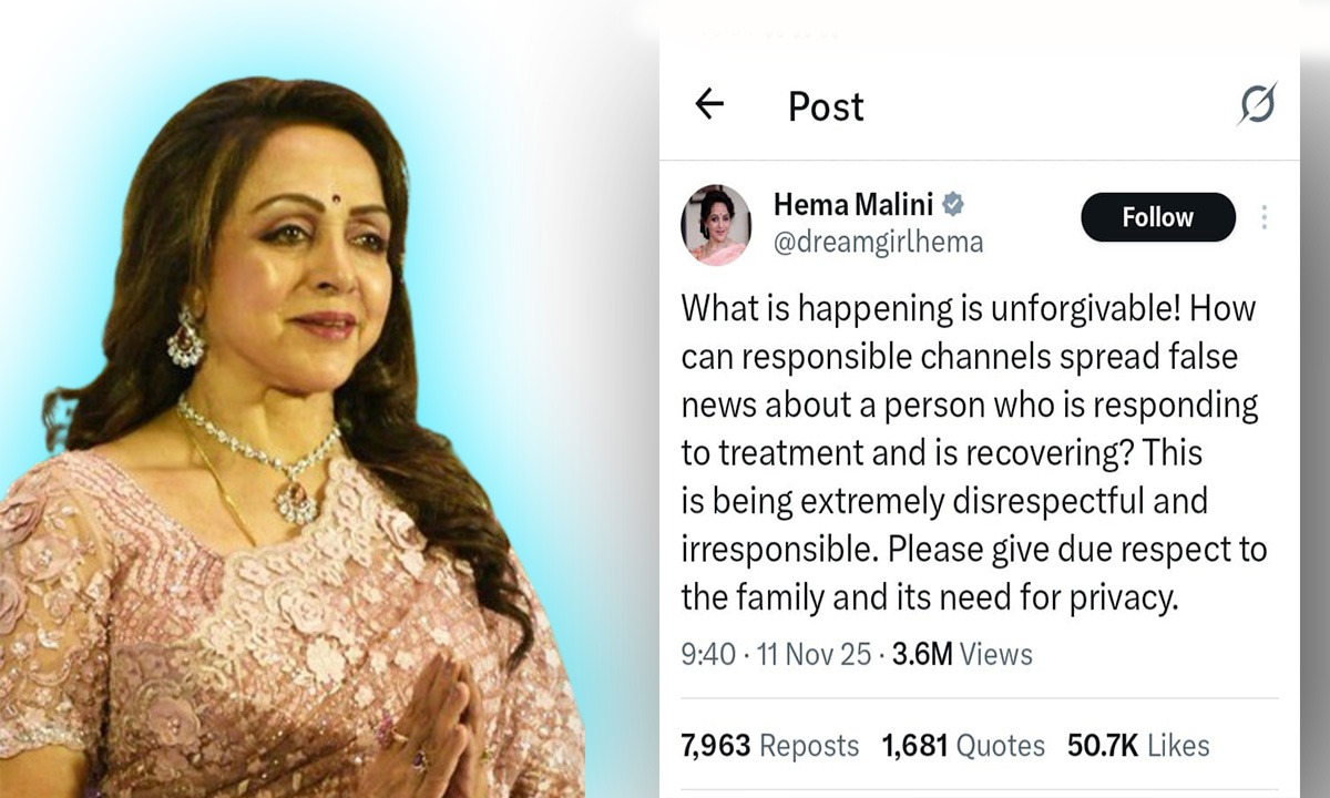উল্লেখ্য, গত অভিনেতা গত ৩১ অক্টোবর প্রথমে শ্বাসকষ্টজনিত সমস্যা নিয়ে মুম্বইয়ের ব্রিচ ক্যান্ডি হাসপাতালে ভর্তি হয়েছিলেন। তারপর বাড়ি ফিরে গেলেও আবারও ১০ই নভেম্বর অবস্থার অবনতি হওয়ায় ফের হাসপাতালে ভর্তি করা হয় তাঁকে। রাখা হয় ভেন্টিলেশন সাপোর্টে। রাত গড়াতেই হাসপাতাল চত্বরে দেখা যায় বলিউডের নামজাদা অভিনেতা-অভিনেত্রীদের। প্রবীণ অভিনেতাকে দেখতে ছুটে আসেন সলমন-শাহরুখ-গোবিন্দাসহ আরও অনেকেই। তারপর থেকেই সোশ্যাল মিডিয়াসহ বিভিন্ন মাধ্যমে ছড়িয়ে পড়ে বর্ষীয়ান অভিনেতার মৃত্যুর ভুয়ো খবর। মঙ্গলবার সকাল থেকেই সংবাদমাধ্যমেও জানানো হয় তাঁর মৃত্যুর খবর। তারপরেই এক্স হ্যান্ডেলে একটি পোস্ট করেন হেমা। সেখানেই ক্ষোভ উগরে দেন তিনি ও মেয়ে এষা দেওল। তিনি জানান, ‘যা ঘটছে তা ক্ষমার অযোগ্য! দায়িত্বশীল চ্যানেলগুলি কীভাবে একজন ব্যক্তির চিকিৎসায় সাড়া দিচ্ছেন এবং সুস্থ হয়ে উঠছেন সে সম্পর্কে মিথ্যা খবর ছড়াতে পারে? এটি অত্যন্ত অসম্মানজনক এবং দায়িত্বজ্ঞানহীন আচরণ। অনুগ্রহ করে পরিবার এবং তাদের গোপনীয়তার প্রয়োজনীয়তার প্রতি যথাযথ সম্মান জানান।’
