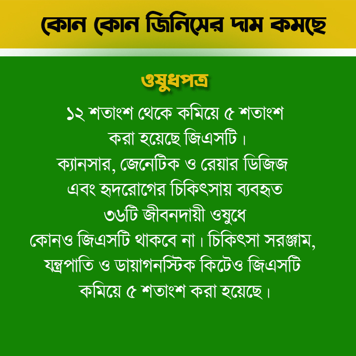 ওষুধের ক্ষেত্রে ১২ শতাংশ থেকে কমিয়ে ৫ শতাংশ করা হয়েছে জিএসটি। জিএসটি থাকছে না ক্যানসার, জেনেটিক ও রেয়ার ডিজিজ এবং হৃদরোগের চিকিৎসায় ব্যবহৃত ৩৬টি জীবনদায়ী ওষুধে। জিএসটি কমিয়ে ৫ শতাংশ করা হয়েছে- চিকিৎসা সরঞ্জাম, যন্ত্রপাতি ও ডায়াগনস্টিক কিটে।
