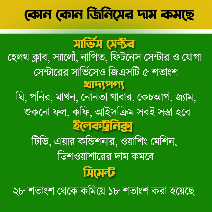 হেলথ ক্লাব, স্যালোঁ, নাপিত, ফিটনেস সেন্টার ও যোগা সেন্টারের সার্ভিসেও জিএসটি ৫ শতাংশ করা হয়েছে। ঘি, পনির, মাখন, নোনতা খাবার, কেচআপ, জ্যাম, শুকনো ফল, কফি, আইসক্রিমের দাম কমছে। দাম কমবে টিভি, এয়ার কন্ডিশনার, ওয়াশিং মেশিন, ডিশওয়াশারের। ২৮ শতাংশ থেকে কমিয়ে ১৮ শতাংশ করা হয়েছে সিমেন্টে।