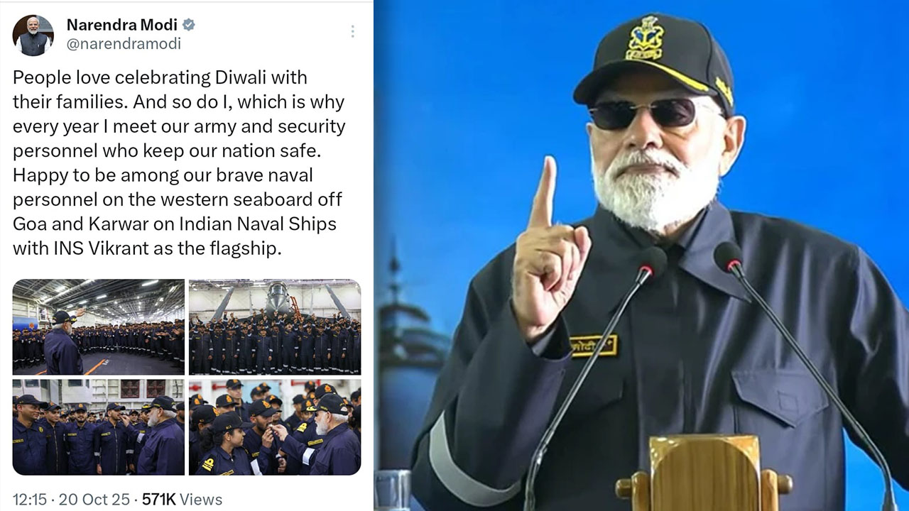 ওই পোস্টে তিনি লিখেছেন, “মানুষ তাদের পরিবারের সঙ্গে দীপাবলি উদযাপন করতে ভালোবাসেন। এবং আমিও তাই করি, যে কারণে প্রতি বছর আমি আমাদের সেনাবাহিনী এবং নিরাপত্তা কর্মীদের সঙ্গে দেখা করি যাঁরা আমাদের জাতিকে সুরক্ষিত রাখে। আইএনএস বিক্রান্তে, ভারতীয় পতাকাবাহী নৌবাহিনীর জাহাজে গোয়া এবং কারওয়ারের পশ্চিম সমুদ্র উপকূলে আমাদের সাহসী নৌবাহিনীর সদস্যদের সঙ্গে থাকতে পেরে আমি আনন্দিত।”