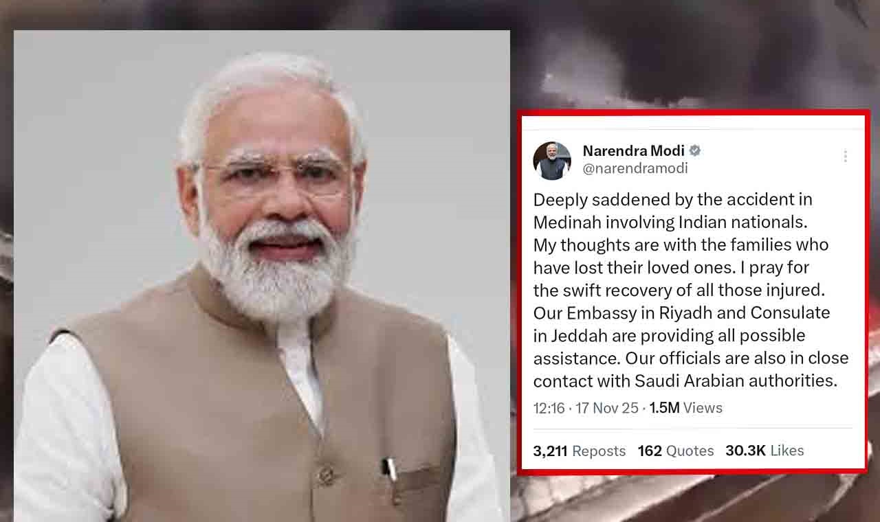 প্রধানমন্ত্রী নরেন্দ্র মোদী সৌদি বাস দুর্ঘটনায় শোক প্রকাশ করেছেন। X-এর একটি পোস্টে তিনি বলেছেন, “মদিনায় ভারতীয় নাগরিকদের দুর্ঘটনায় গভীরভাবে শোকাহত। যাঁরা তাঁদের প্রিয়জনদের হারিয়েছেন তাদের পরিবারের প্রতি আমার সমবেদনা। আমি আহতদের দ্রুত আরোগ্য কামনা করি। রিয়াদে আমাদের দূতাবাস এবং জেদ্দায় কনস্যুলেট সম্ভাব্য সকল সহায়তা প্রদান করছে। আমাদের কর্মকর্তারা সৌদি আরব কর্তৃপক্ষের সাথেও ঘনিষ্ঠ যোগাযোগ রাখছেন।”