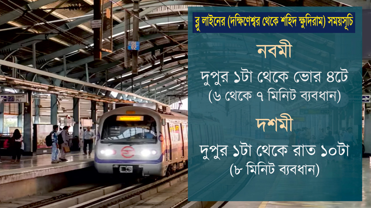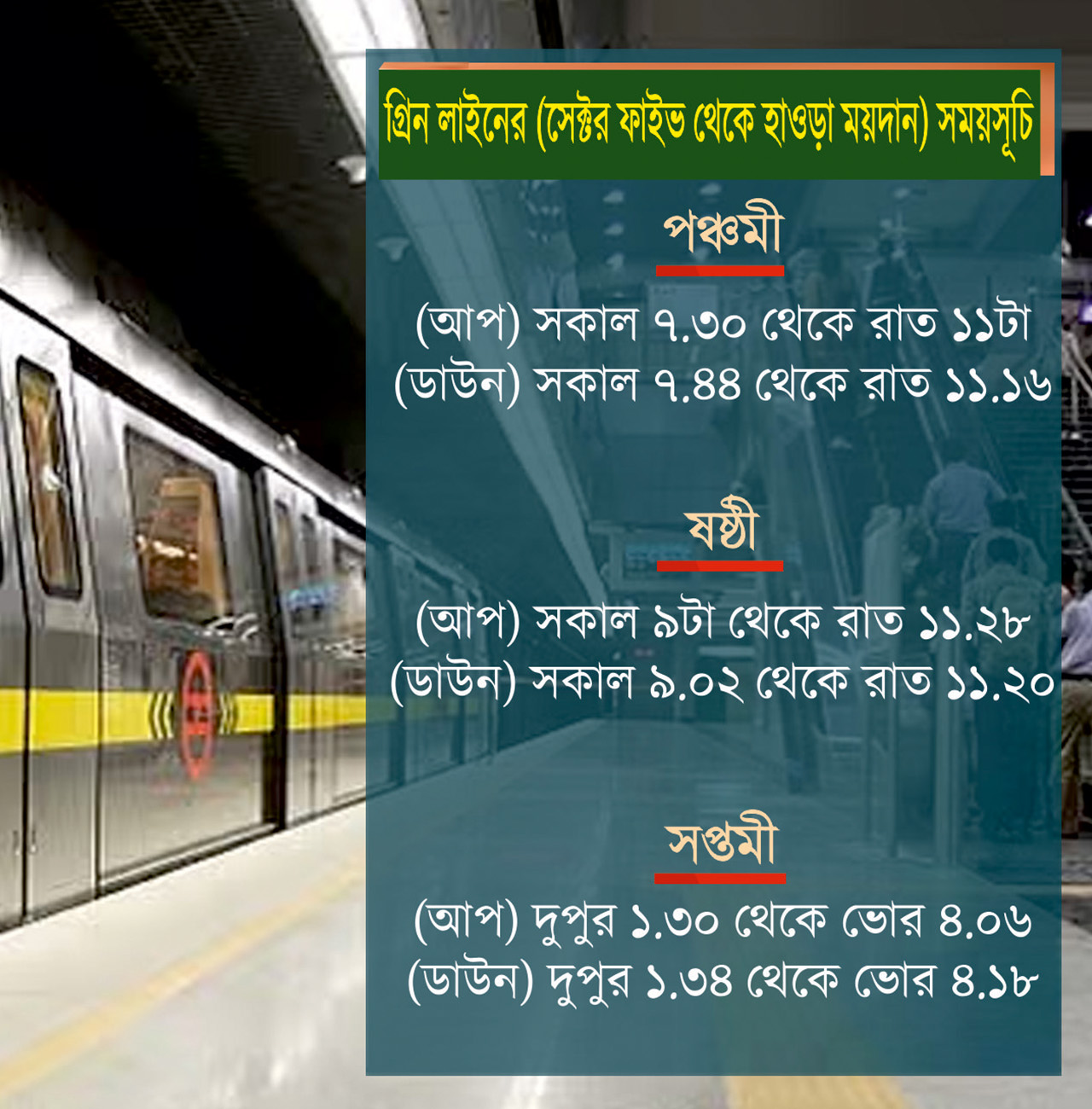 নিজস্ব সংবাদদাতা : বাঙালির সেরা উৎসব দুর্গাপুজো। যার জোয়ার এসে পড়ে শহর কলকাতায়। পুজোর জন্য গোটা কলকাতায় যানবাহন চলাচল নিয়ন্ত্রিত থাকে। লাক্ষ লক্ষ দর্শনার্থী, অথচ কলকাতার এক প্রান্ত থেকে অন্য প্রান্তে পুজো দেখার বাধা যাতায়াত। এই পরিস্থিতিতে মেট্রোরেলই একমাত্র সহজ উপায়। এবার আবার কুলে গেছে ইস্ট ওয়েস্ট মেট্রোর কিছু পথ। এয়ারপোর্ট থেকে হাওড়া ময়দান, দক্ষিণেশ্বর থেকে গড়িয়া, ওদিকে নোয়াপাড়া থেকে এয়ারপোর্ট, বেলেঘাটা থেকে রুবি। ফলে বেশির ভাগ মানুষ এবার চাইবে মেট্রোয় পুজোর কলকাতা ঘোরা। এসজন্য মেট্রোরেল কর্তৃপক্ষ ষষ্ঠী থেকে দশমী বাড়তি মেট্রো , সেইসঙ্গে সারারাত মেট্রো চলাচল চালু রাখছে। তাই পুজোয় যাঁরা কলকাতার বিভিন্ন প্যাণ্ডেলে প্রতিমা দেখার পরিকল্পনা করেছেন তাঁদের কাছে খুশির খবর। অন্তত পুলিশের কড়াকড়ি, যানজটের থেকে রেহাই পাবার জন্য একমাত্র সহজ উপায় মেট্রোরেলে যাতায়াত। দিনের বেলায় তো বটেই, তবে পুজো দেখার আসল সময় সারারাত মিলবে মেট্রোরেল। মঙ্গলবার তার সময়সূচি প্রকাশ করেছে মেট্রো কর্তৃপক্ষ। নিচে দেওয়া হল সেই সফরসূচি।