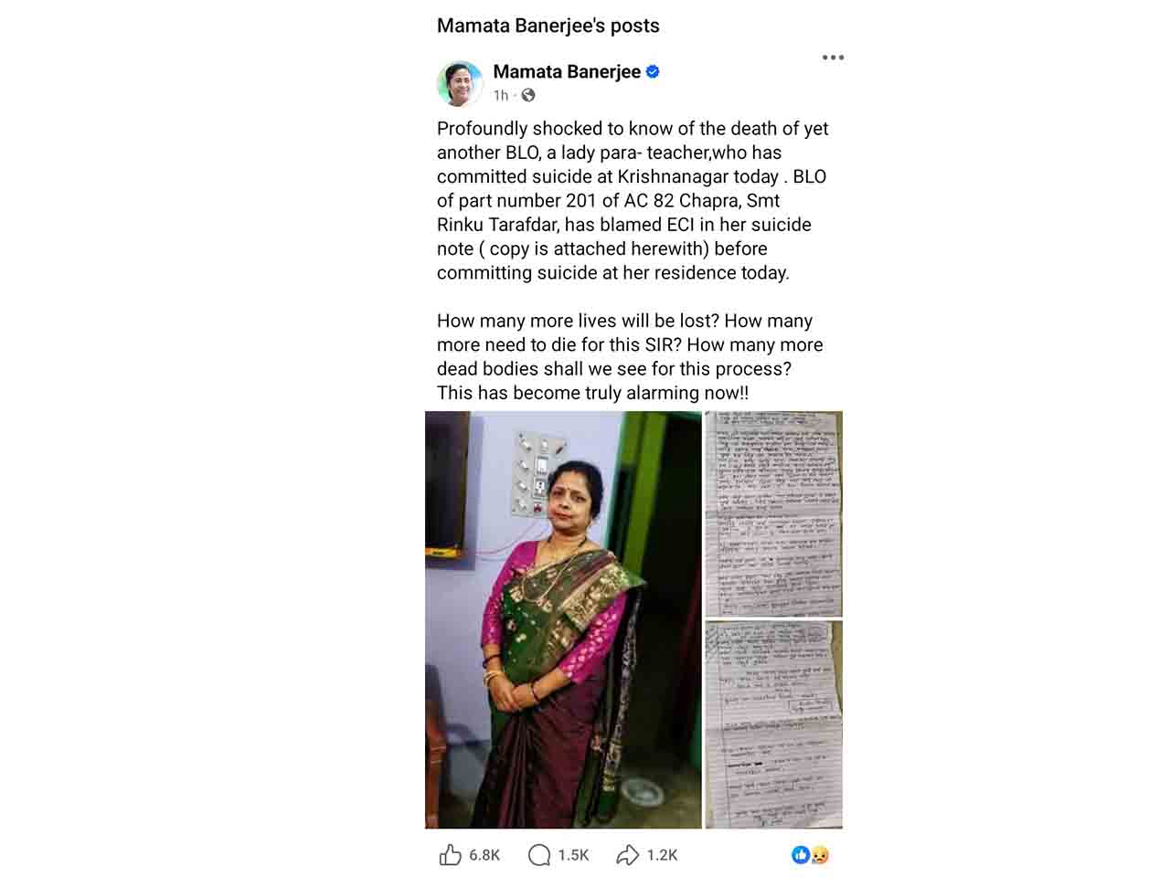 শনিবার নিজের ফেসবুক পেজে মৃত রিঙ্কু তরফদারের ছবি এবং তাঁর লেখা সুইসাইড নোট শেয়ার করেছেন মুখ্যমন্ত্রী। সেই পোস্টে রাজ্যের প্রশাসনিক প্রধান প্রশ্ন তুলেছেন, এসআইআর প্রক্রিয়ার জন্য আর কত জনকে মরতে হবে? মুখ্যমন্ত্রী লিখেছেন, ‘আজ কৃষ্ণনগরে আরও একজন বিএলও, একজন মহিলা পার্শ্বশিক্ষিকা আত্মহত্যা করেছেন। তাঁর মৃত্যুর খবরে আমি গভীরভাবে মর্মাহত। ৮২ নম্বর চাপড়া বিধানসভার ২০১ নম্বর পার্টের বিএলও, শ্রীমতি রিঙ্কু তরফদার, তাঁর বাড়িতে আত্মহত্যা করার আগে লেখা সুইসাইড নোটে নির্বাচন কমিশনকে দায়ী করেছেন।’ মমতা এর পরে লেখেন, ‘আর কত প্রাণ যাবে? এই এসআইআর এর জন্য আরও কত জনকে মরতে হবে? এই প্রক্রিয়ার জন্য আমরা আর কত মৃতদেহ দেখব? এটি সত্যিই উদ্বেগজনক হয়ে উঠেছে !’